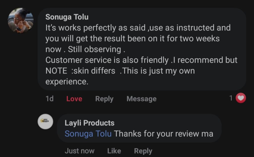 Nobody believed me when I started using this product. They all said I had wasted N45,000. After 2 Weeks, no more wrinkles, under eye bag and dark circles. I look so much younger that everyone is asking what my secret it.